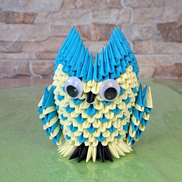Diese dekorative Eule wurde aus zahlreichen modularen Papierfaltungen in lebhaftem Türkis und zartem Pastellgelb aufgebaut. Die dicht aneinandergereihten Module erzeugen eine plastische, federähnliche Oberfläche; die markanten Ohrspitzen, seitlichen Flügel und die großen Wackelaugen geben der Figur Persönlichkeit und einen verspielten Ausdruck.