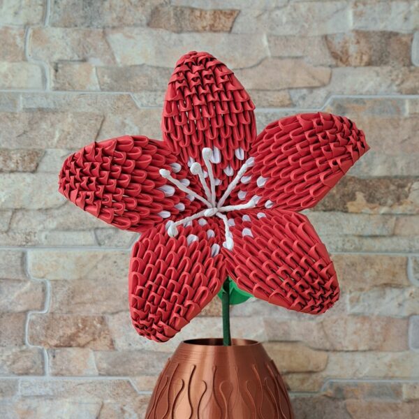 Diese ausdrucksstarke Lilie wurde vollständig in Modular‑Origami‑Technik von Hand gefertigt. Hunderte einzelne Papiermodule formen fünf großzügige, plastische Blütenblätter in intensivem Rot mit dezenten hellen Akzenten und feinen Staubfäden im Zentrum. Die sorgfältige Modulverzahnung verleiht der Blüte eine lebendige Textur und plastische Tiefe, sodass sie wie eine natürliche Lilie wirkt – jedoch dauerhaft und pflegeleicht.