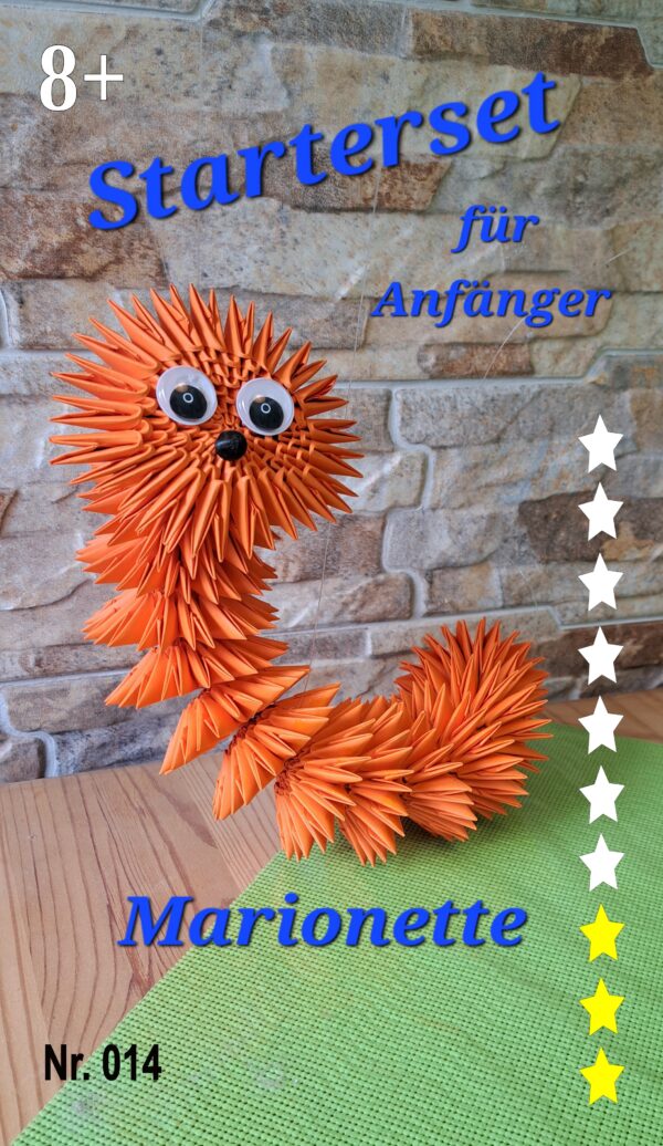 Die übersichtliche Anleitung erklärt das Falten der Module, das schrittweise Zusammensetzen zu Segmenten sowie das Montieren der Marionettenfäden. Dank vorgefertigter Module lässt sich schnell ein sichtbares Ergebnis erzielen — ideal für Kinder, Anfänger und als Geschenk.